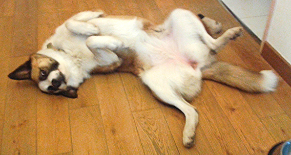 Gally en mode petit clown qui attend les gratouilles sur le ventre